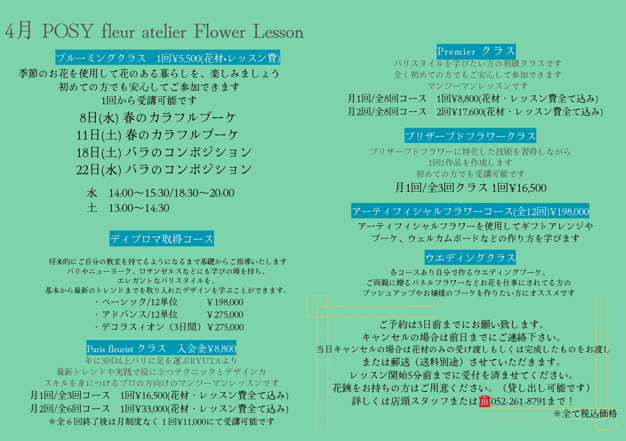 POSY fleur atelier では、4月も季節のお花を楽しめるレッスンをご用意しております。